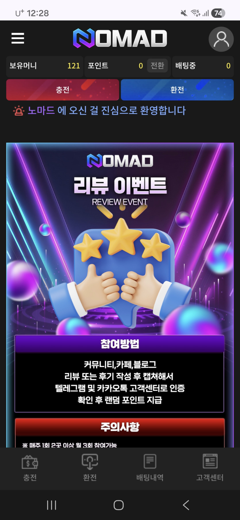 안녕하세요 매월 마다 지나면 리뷰 재 신청 가능합니다 그리고 포인트도 랜덤으로 받을수 있어서 그거도 재미있고 충전을 안해도 되니 너무 좋습니다 노마드 항상 사랑합니다 항상 만괂부 제발 이런사이트 업습니다